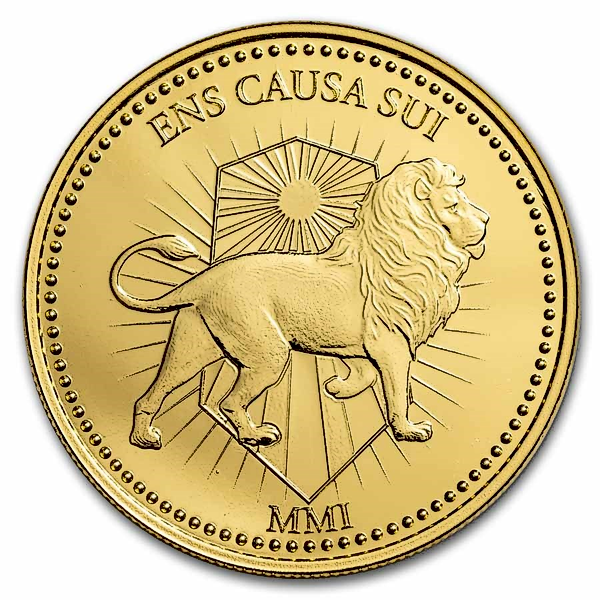 The obverse of the Round features a lion in stride with a large shield in the background. "Ens Causa Sui" and “MMI” can be read along the top and bottom.