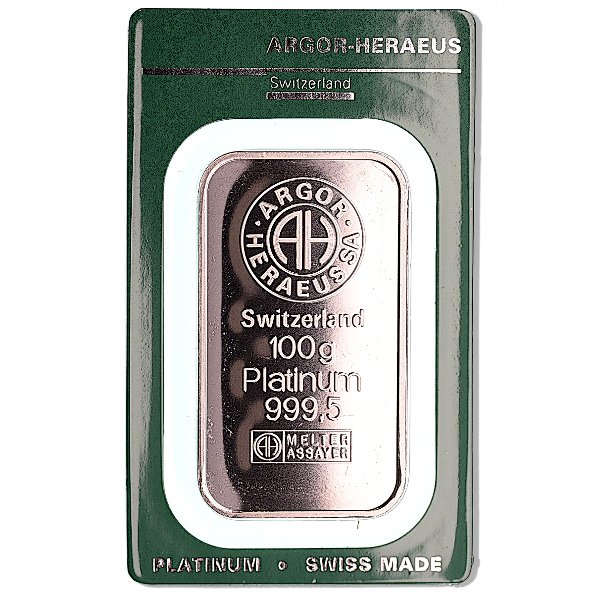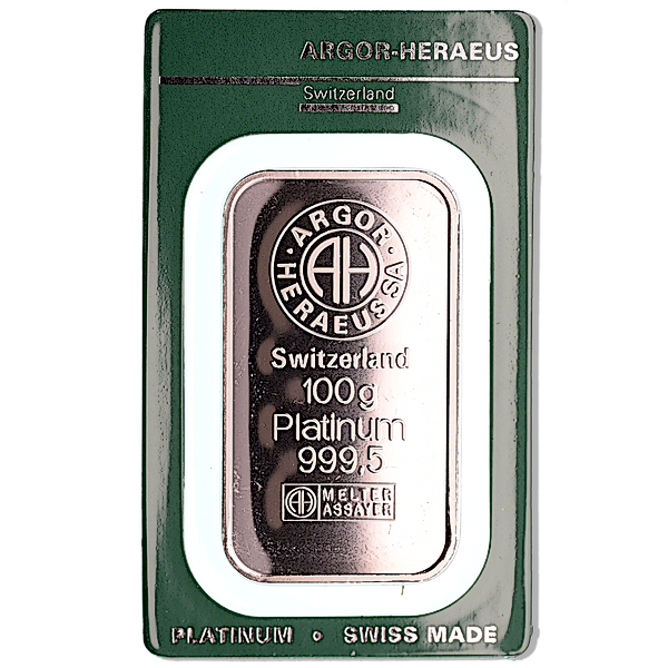 This 100 gram minted platinum bar has a purity of 99.95% platinum and is fabricated by the famous Swiss precious metals refinery Argor-Heraeus.