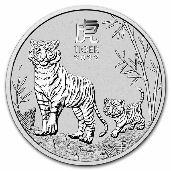 This 5 ounce Australian Silver Lunar bullion coin from 2022 celebrates the Chinese Year of the Tiger.